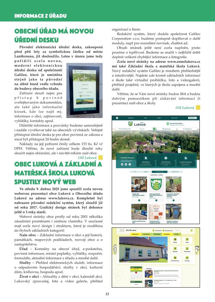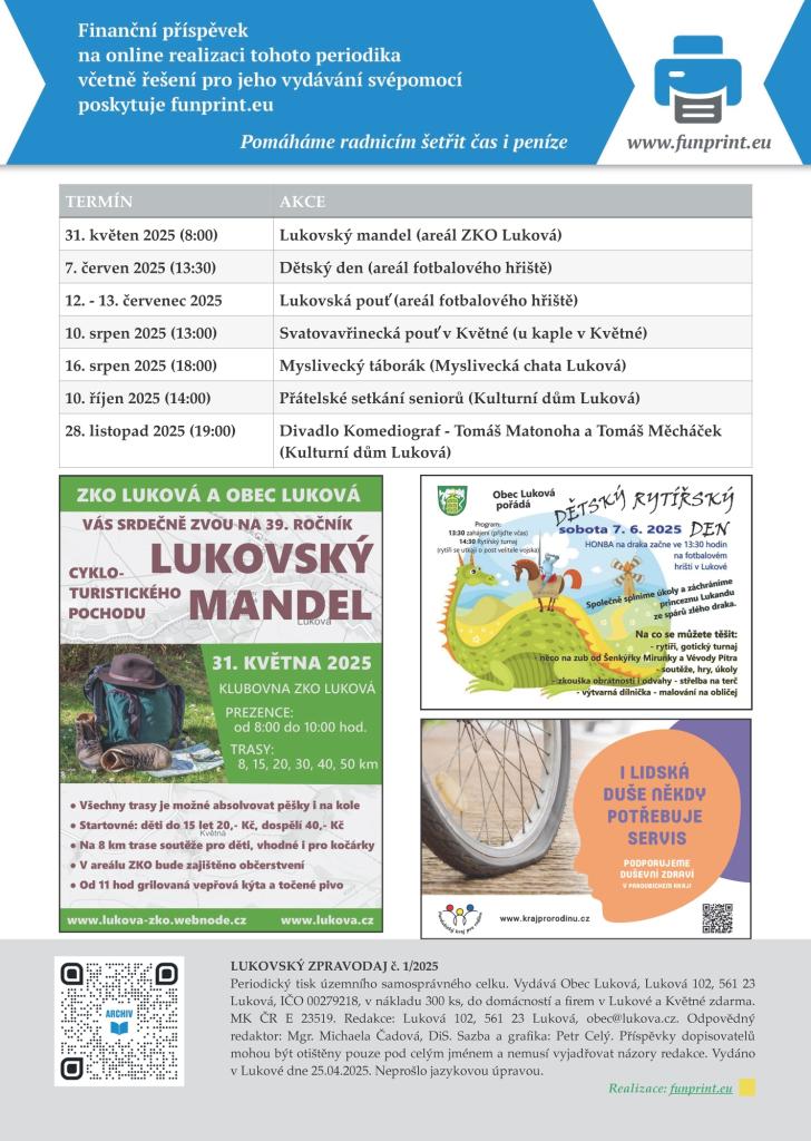 Pokud jste zpravodaj do schránky nedostali, prosíme oznamte nám to emailem: obec@lukova.cz nebo na tel 465 394 141.